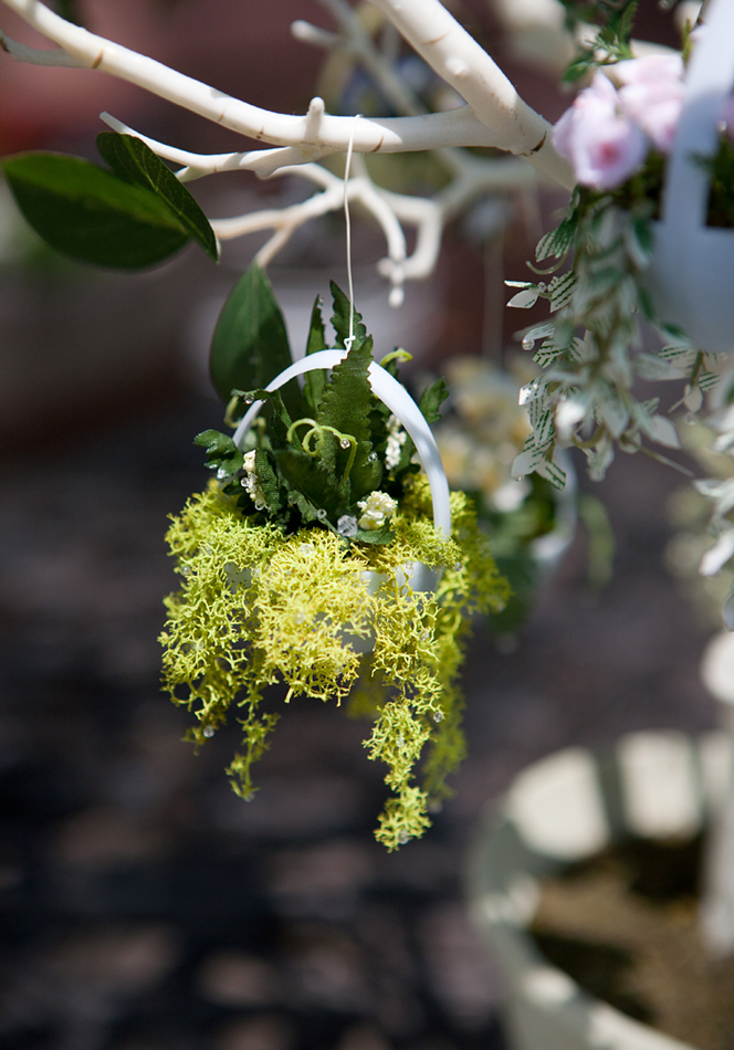 After I finished each miniature plant, with it’s tiny leaves and petals, I hung it on the tree. Though pretty, the plant didn’t seem fully alive it was all sparkled up with spring rain or drops of dew.