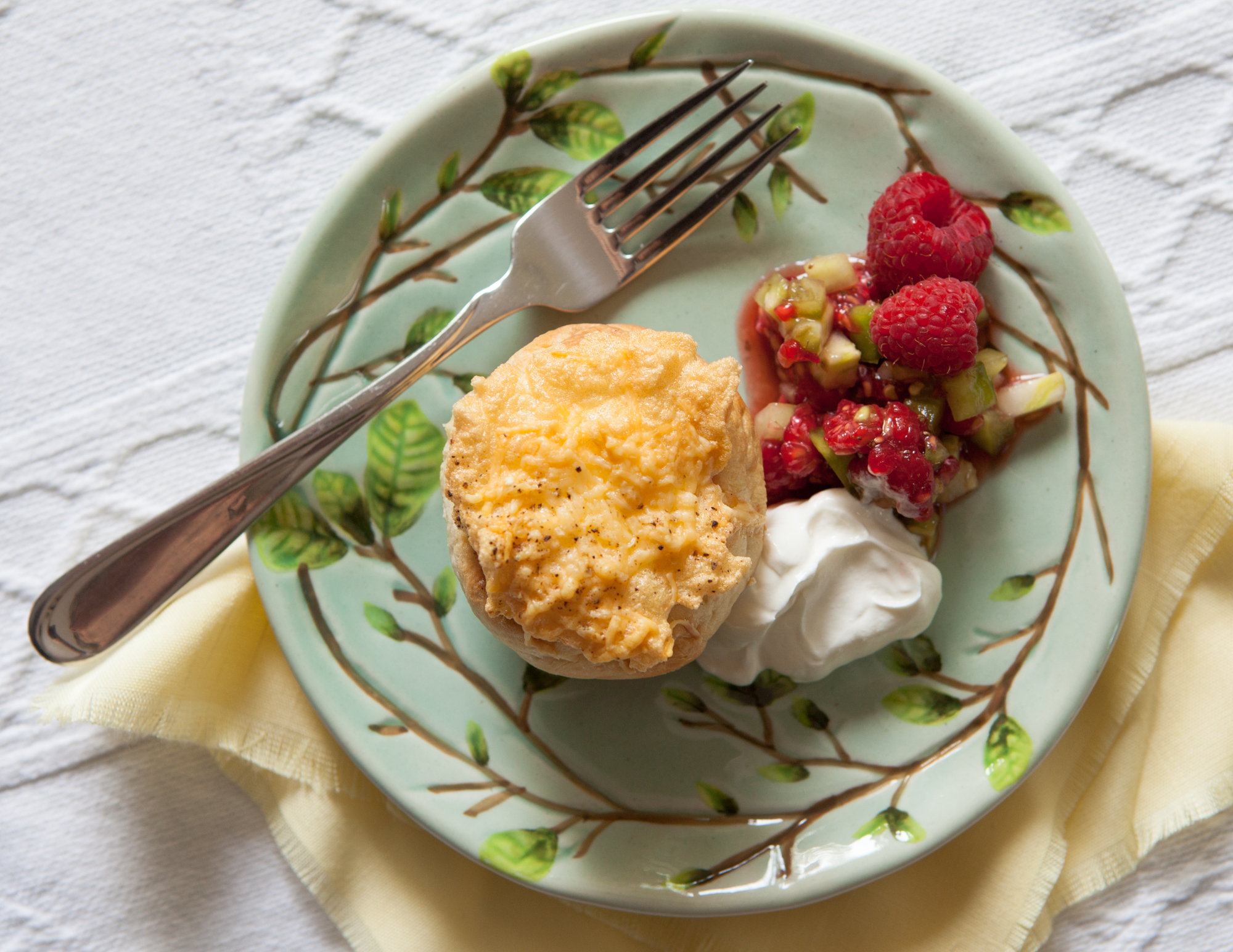 Meringue Breakfast Buns, hot from the oven, served with Cucumber Raspberry Relish and Sour Cream.