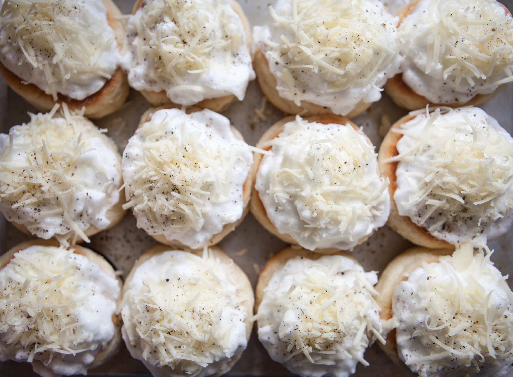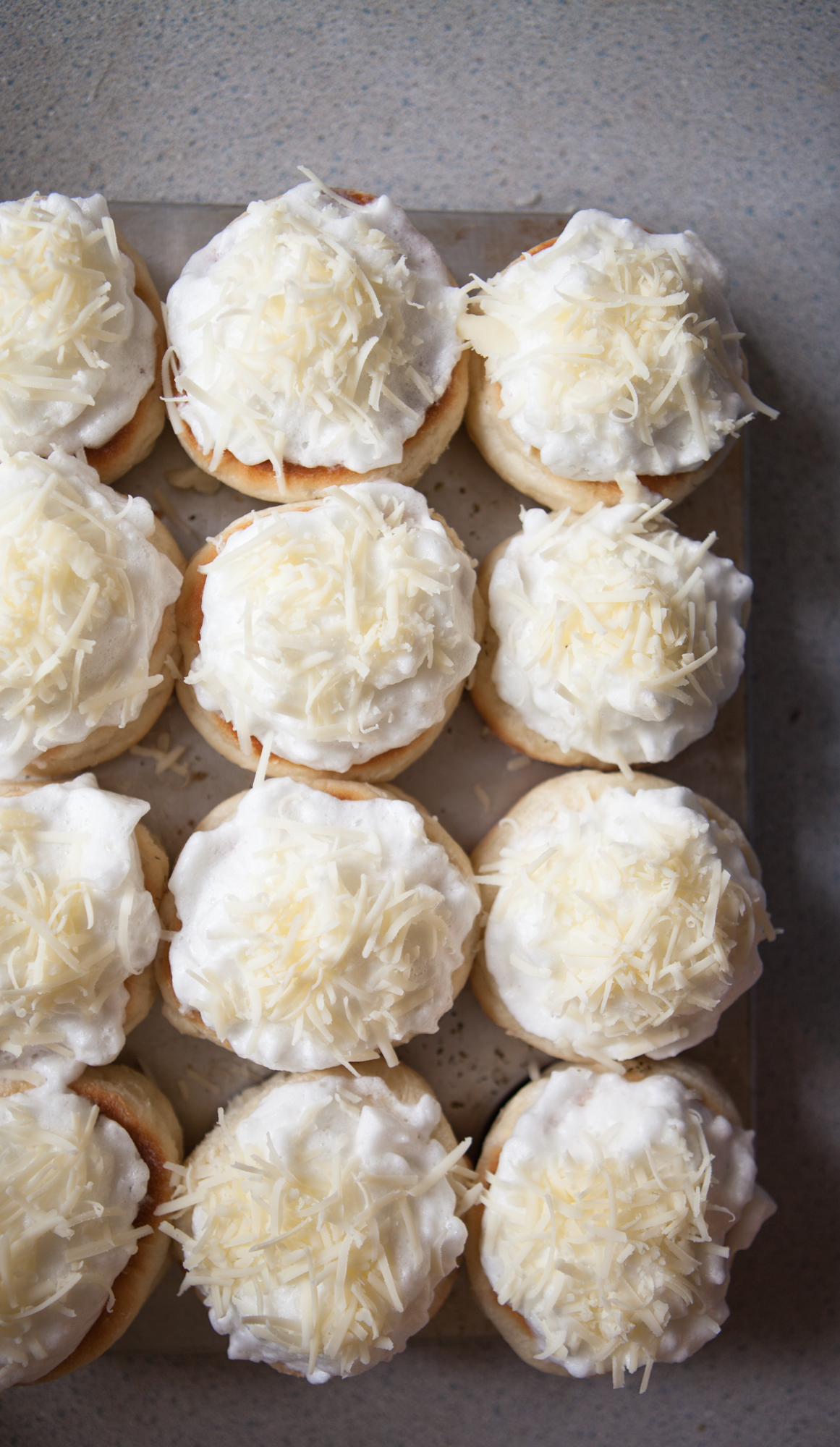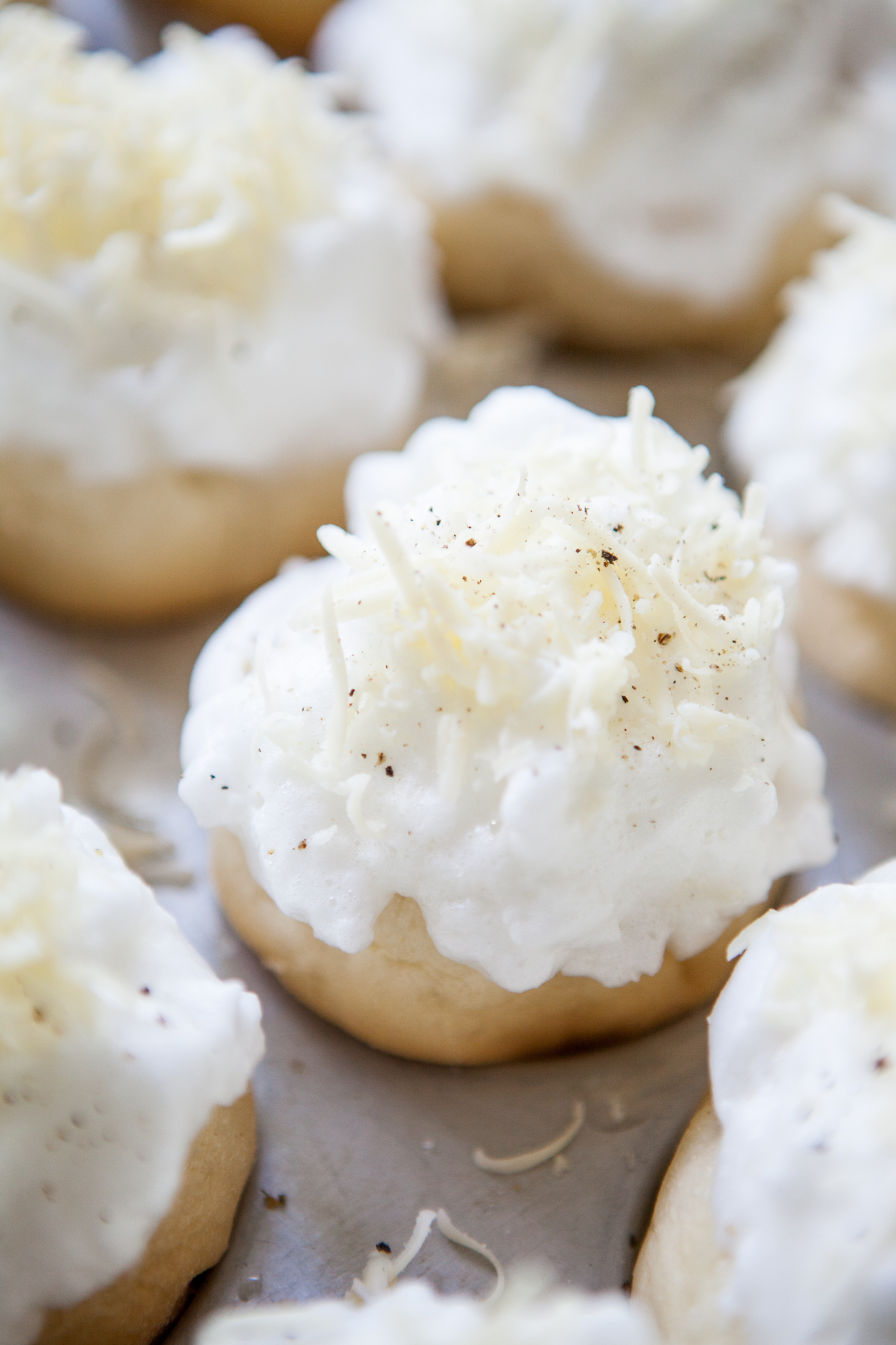 Sprinkle grated cheese on top of the meringues.
