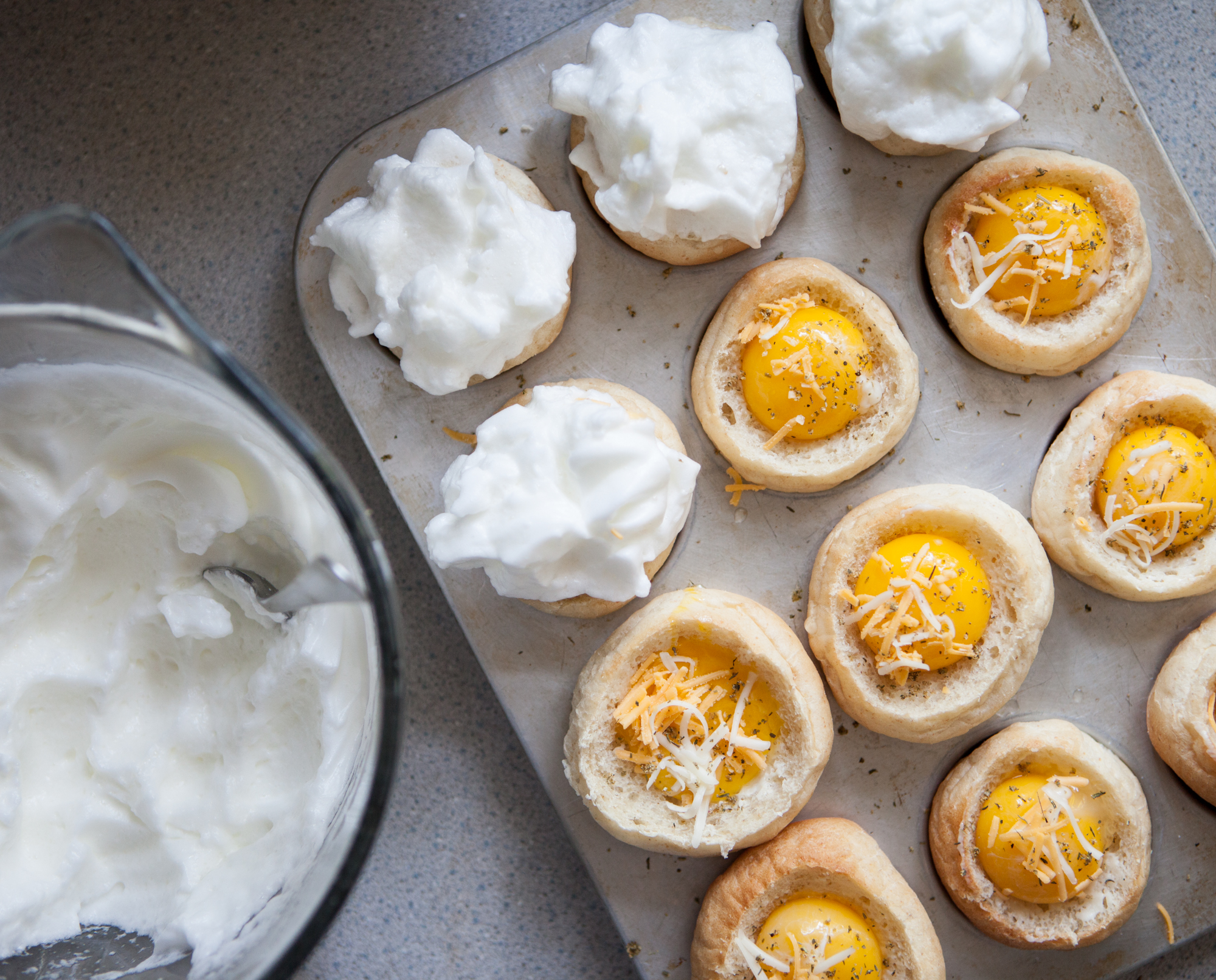 Meringue Breakfast Buns, with crisp cheese-topped meringue and hot, liquid egg yolk inside.