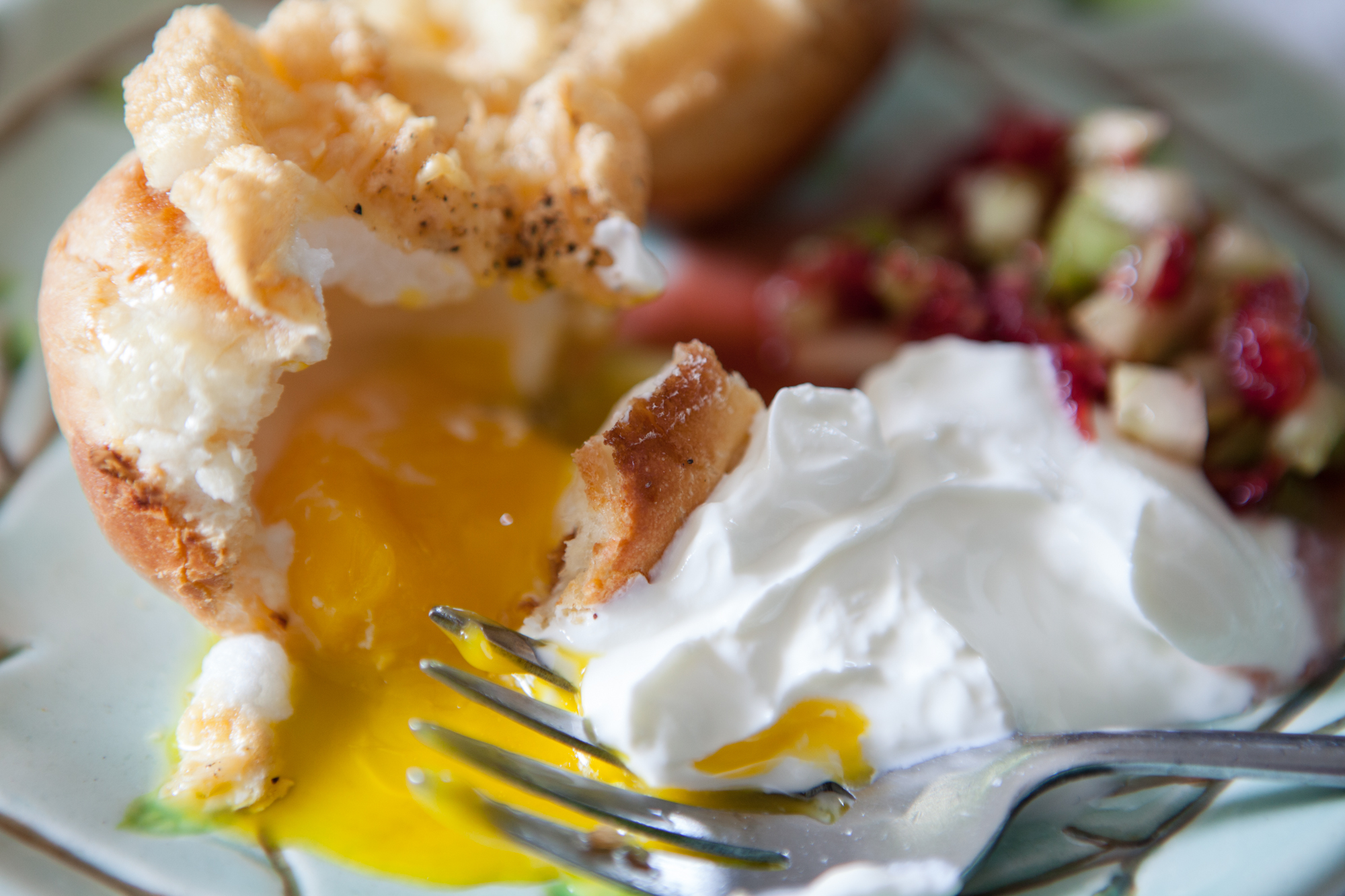 Meringue Breakfast Buns – an egg yolk in a bun topped with cheesy meringue, served with Balsamic Cucumber Raspberry relish and sour cream.