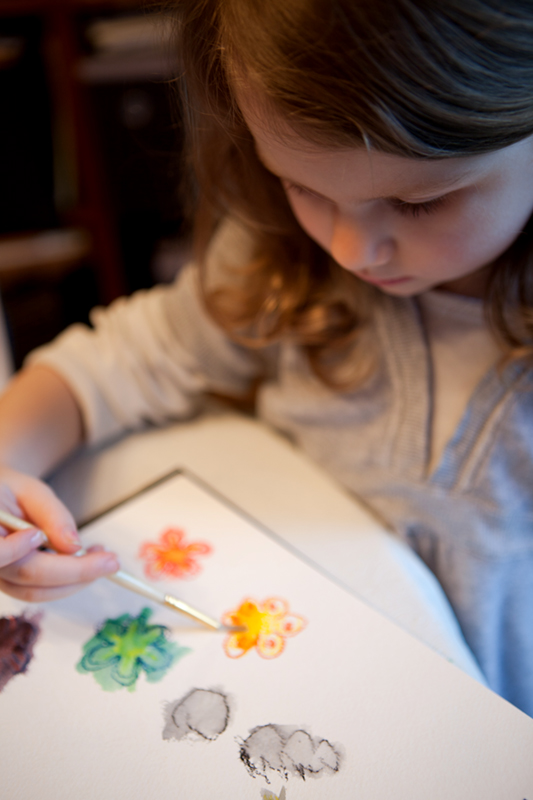 She didn’t understand the concept at first but with my instruction, she carefully scribbled a little splotch of red next to blue with the pencils. She scribbled yellow next to blue, red next to yellow, green next to red. When the paper was covered with little bits of scribbled yellow, blue, green, red and orange, we got out the paintbrush. When the brush first touched the blue scratch marks and burst into a wash of color, she looked up at me with absolute wonder and delight.