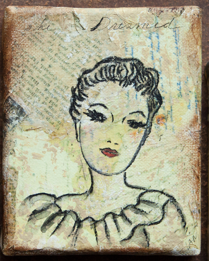 The background is created from bits of tissue copies of my grandmother’s handwritten recipes and an issue of The Household magazine from 1924. The images of women are inspired from a Ziegfeld Girl coloring book that my beautiful, creative mom colored back in 1941. The writing on each piece is a tribute to my creative sisters – she Smiled, for Suzanne; she Dreamed, for Donna; and she Journeyed, for me, Julia, the only sister who moved away and stayed.