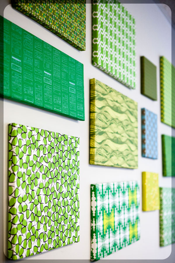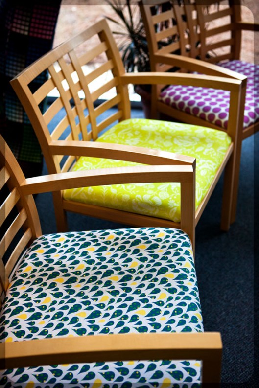 Reupholstered chair pads, each a different pattern and color. I would love to do something like this for our occasional chairs, perhaps using fabric featuring my own children’s drawings, or fabric designed from one of my mom’s floral paintings!