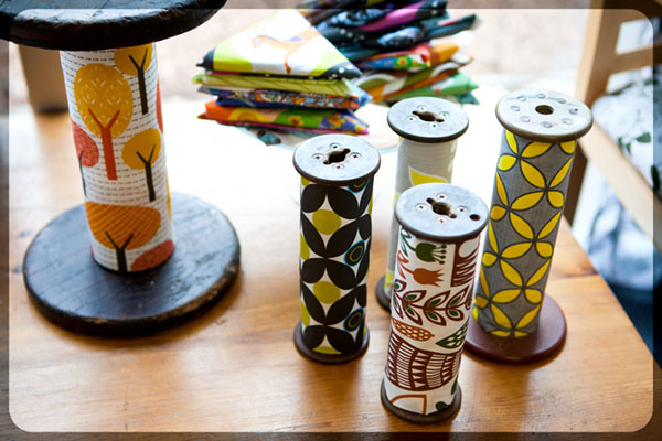 Old spools were wrapped with strips of fabric printed by Spoonflower.
