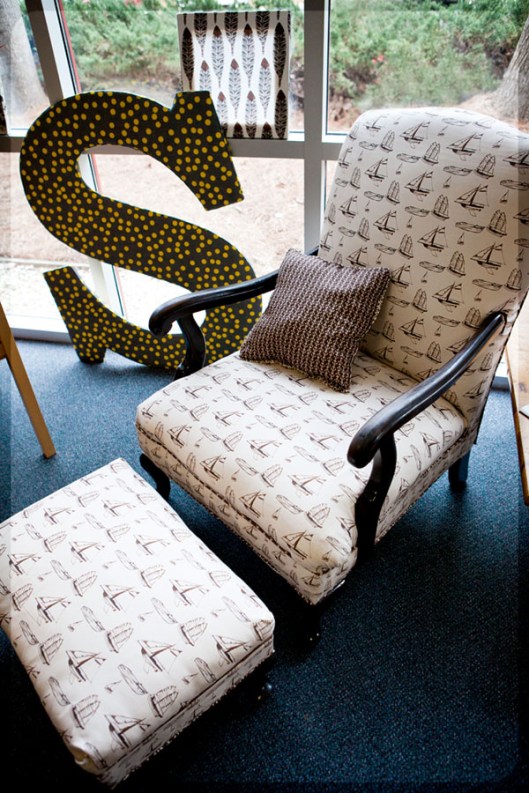 Another staff-created project was this reupholstered chair. What a terrific idea to update a piece of furniture. The pillow, the picture against the window, the giant “S” … all done with fabrics from Spoonflower designers.